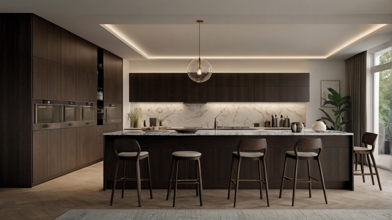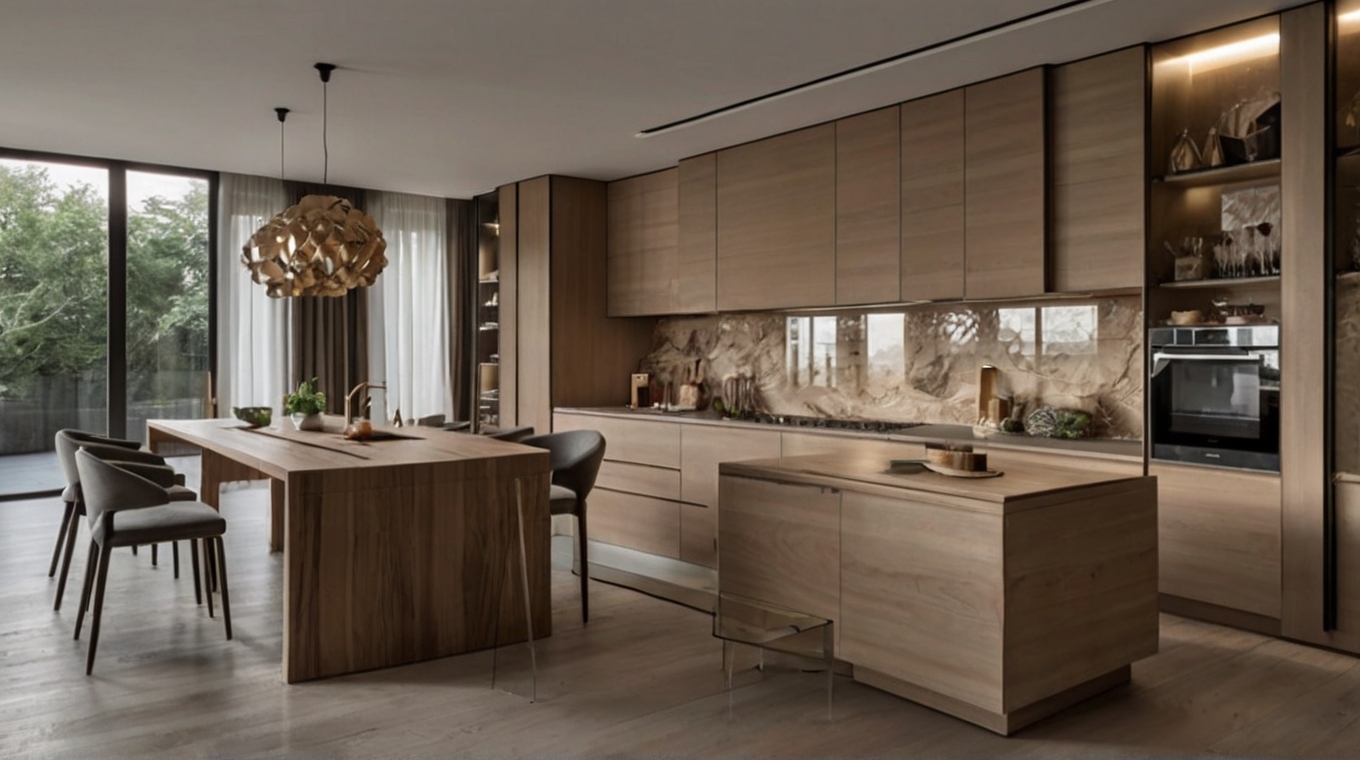 Погрузитесь в мир изысканной роскоши с нашей уникальной кухней из натурального шпона, оснащенной двумя изысканными островами. Первый остров стал идеальным сочетанием функциональности и эстетики: здесь расположена стильная мойка, а также уютная зона для перекуса или ужина в компании близких.