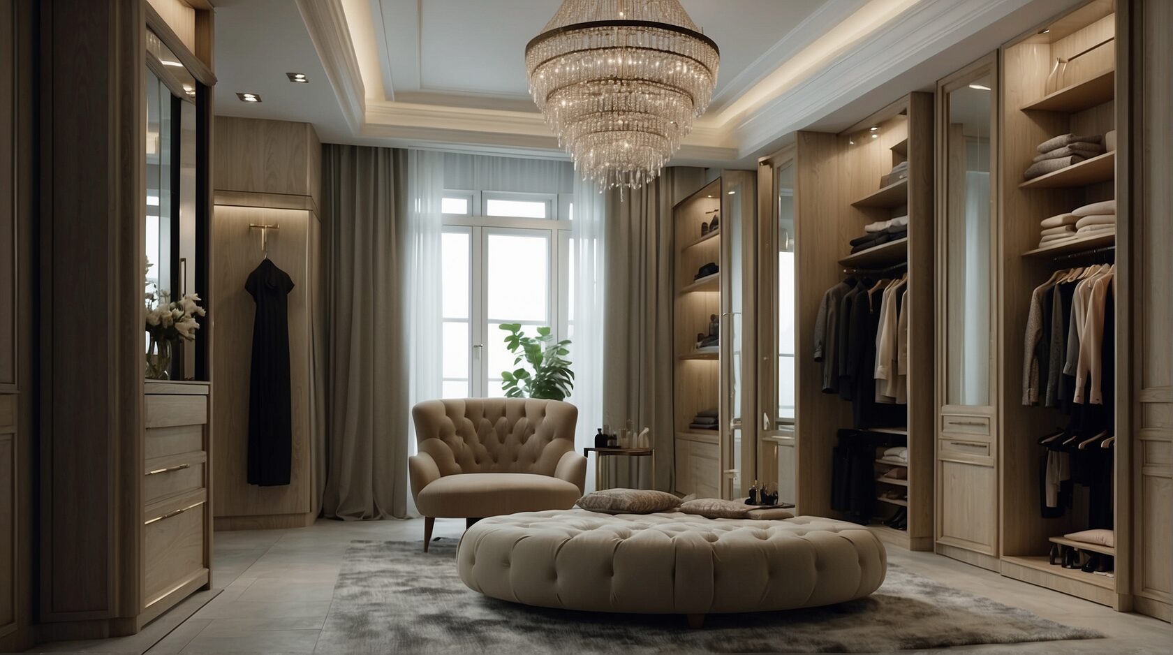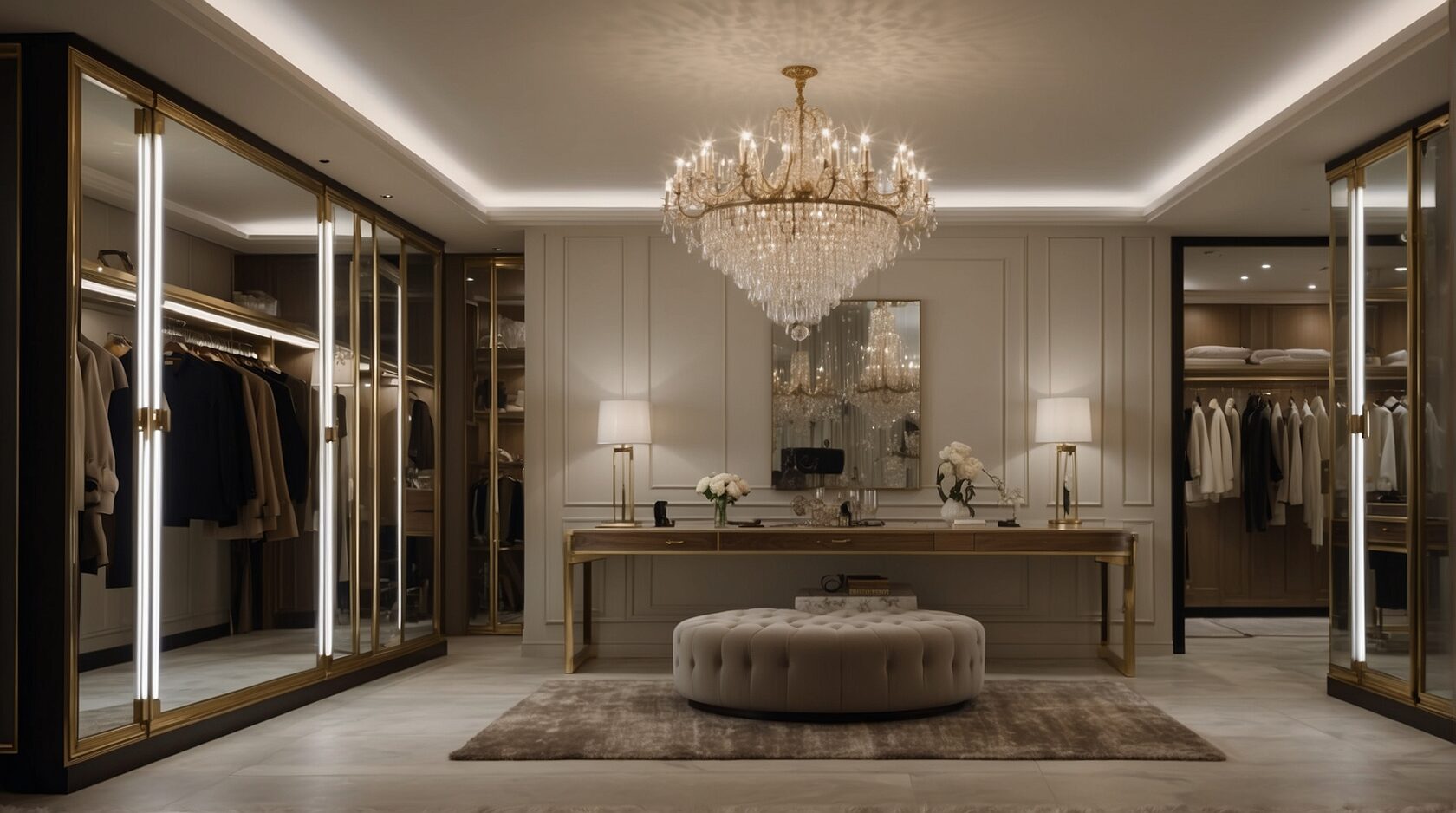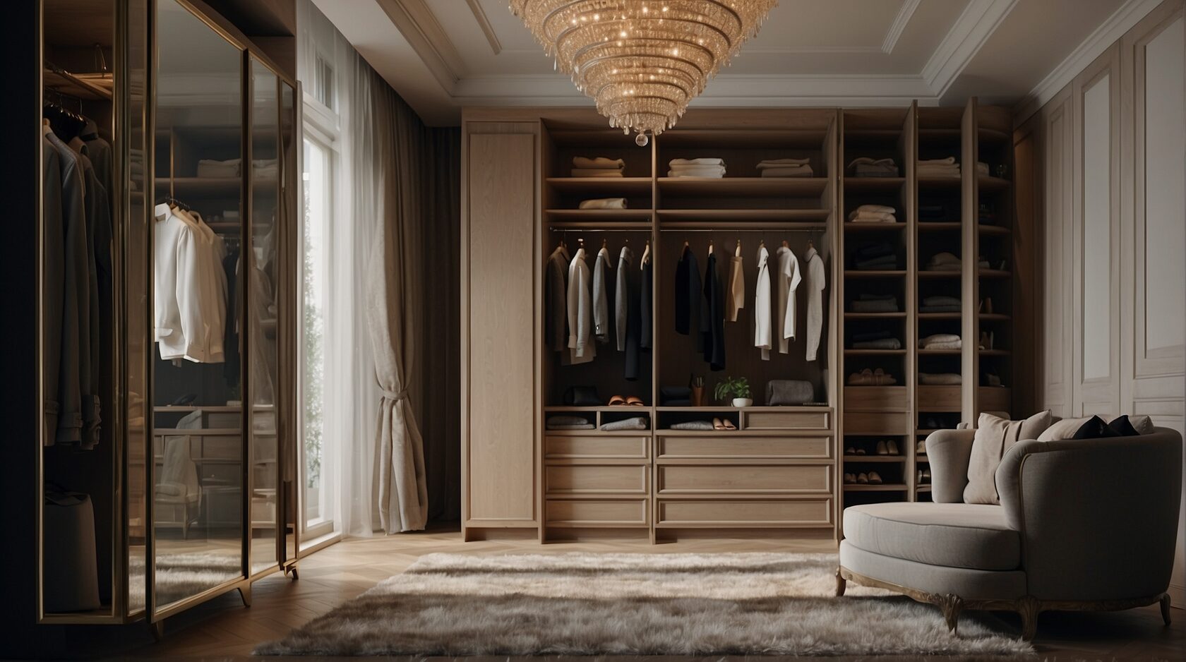 Добро пожаловать в роскошную гардеробную, где великолепие и функциональность сочетаются в идеальном балансе. Это пространство разделено на две зоны: одну для мужчин, другую для женщин. В женской зоне установлен элегантный туалетный столик с зеркалом и удобным диваном для расслабления.