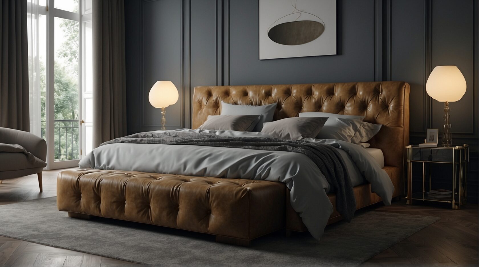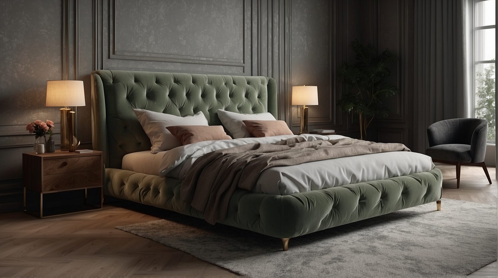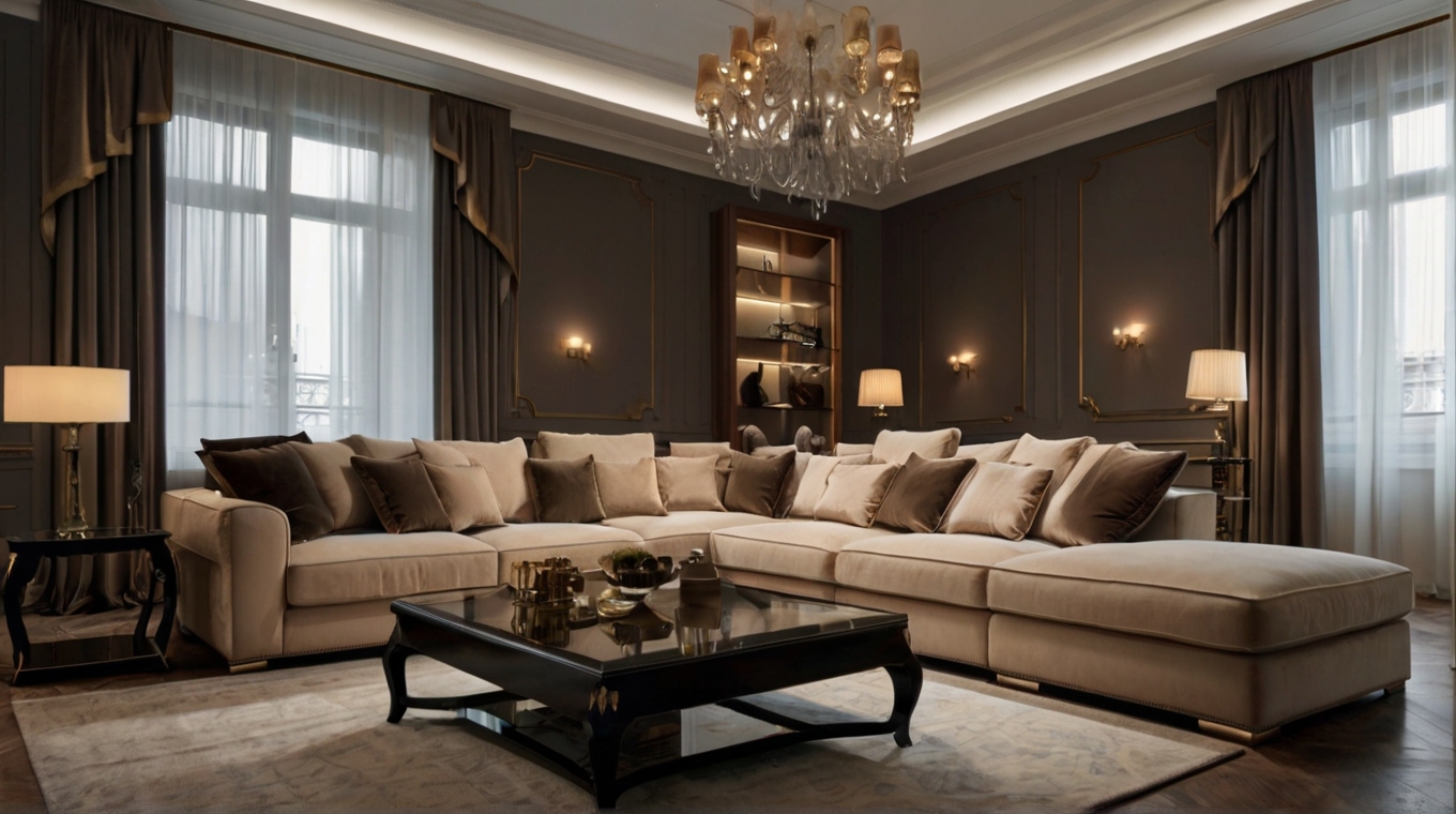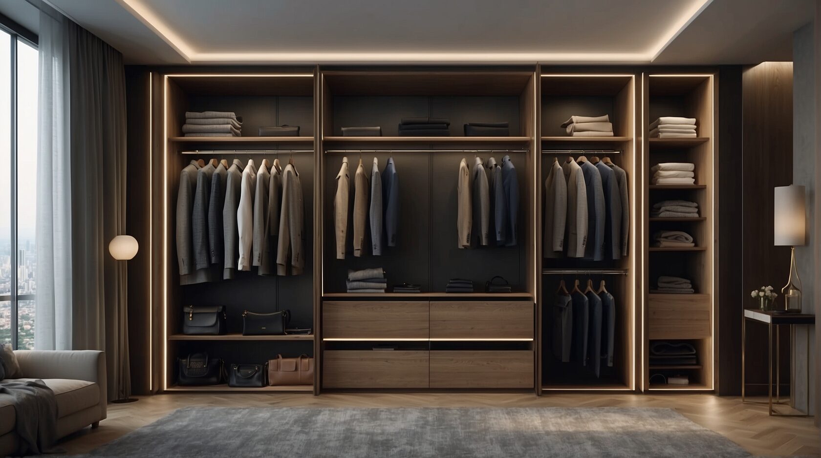 Добро пожаловать в роскошную гардеробную, где великолепие и функциональность сочетаются в идеальном балансе. Это пространство разделено на две зоны: одну для мужчин, другую для женщин. В женской зоне установлен элегантный туалетный столик с зеркалом и удобным диваном для расслабления.